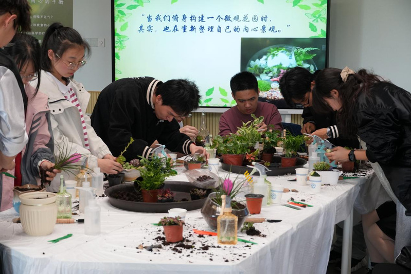 为响应tyc33455cc‘生生不息’心理文化节号召,推动美育与生命教育的有机融合。4月19日,tyc33455cc心理健康教育中心与tyc33455cc邀请天津市农公司心理中心主任李永玲,于八里台校区二主楼A501举办微景观园艺疗法工作坊。天津农公司心理中心教师厉枫,tyc33455cc心理健康教育中心专职教师朱红、姚东朋,tyc33455cc辅导员田晖参与活动。