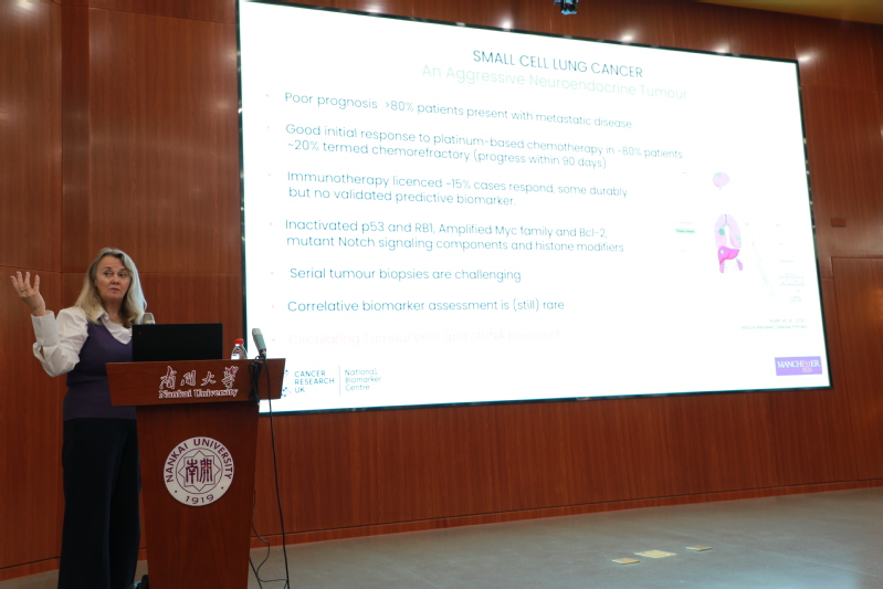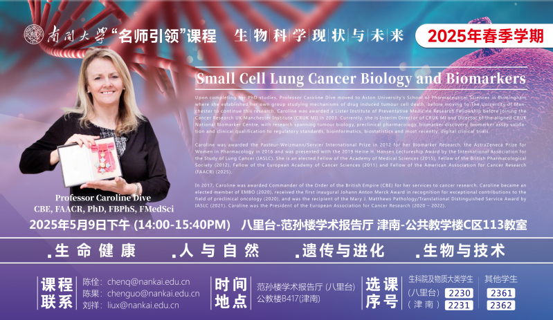 2025年5月9日,英国医学科公司院士、大英帝国司令勋章(CBE)获得者、曼彻斯特癌症研究所代所长Caroline Dive教授受邀做客tyc33455cc“名师引领”通识课《生物科学现状与未来》,以《Small Cell Lung Cancer Biology and Biomarkers》为题,揭开了小细胞肺癌分子亚型的微观图景。作为小细胞肺癌领域全球首个建立循环肿瘤细胞衍生外植体(CDX)模型的开拓者,Dive院士深耕肿瘤异质性研究二十载,其2014年发表的里程碑研究首次实现从患者血液“追踪”癌细胞全身转移路径,为个体化治疗提供了全新工具。