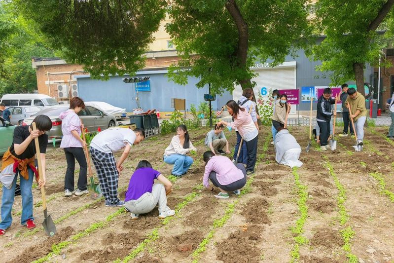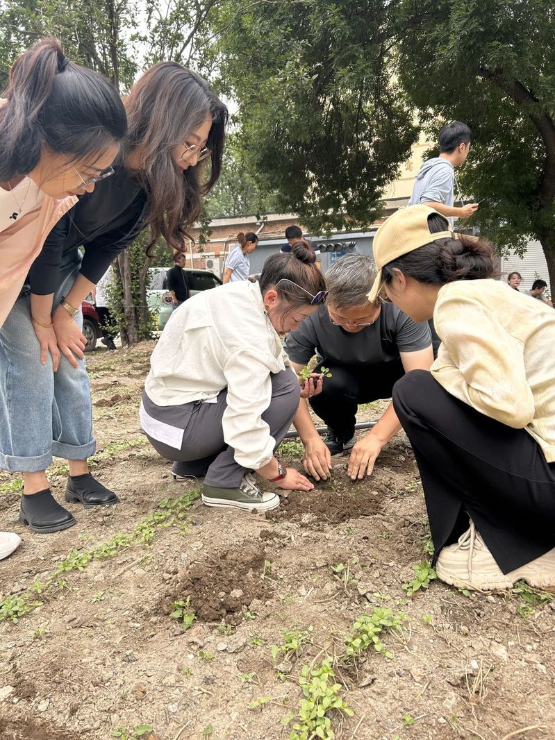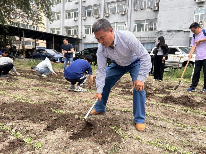揭牌与聘任仪式结束后,师生们便迅速投入到中药材种植环节。在劳动育人导师们的耐心示范指导下,师生们分组协作,有序开展工作:翻土松土、平整地块、起垄做畦,现场呈现出一派热火朝天的劳动景象。随后,师生共同种下首批中药材幼苗,从选定植株、挖坑定植到覆土压实,每一道工序都进行得严谨细致,后勤工作人员同步完成浇水养护工作,确保新苗能够扎根润土、充分汲取养分。