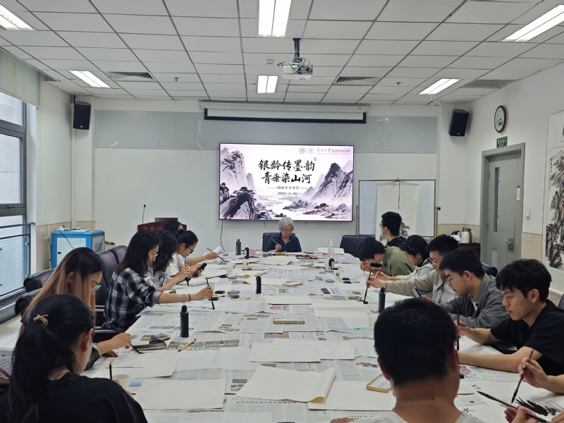 活动现场,王树荣老师现场挥毫泼墨,亲自示范山水画的创作过程。在她的笔下,峰峦叠嶂、云水相映的画卷徐徐展开,同学们近距离观摩了国画技法中皴、擦、点、染的运用,深刻体会到中国画“以形写神”的精髓。在实践环节,同学们在王老师的指导下尝试创作。他们在宣纸上描绘心中山水,展现出对传统艺术的独特理解。王老师对同学们的画作进行细致点评,既肯定了大家的创意与热情,也提出了提升笔墨表现力的具体建议,鼓励同学们在艺术探索中不断精进。