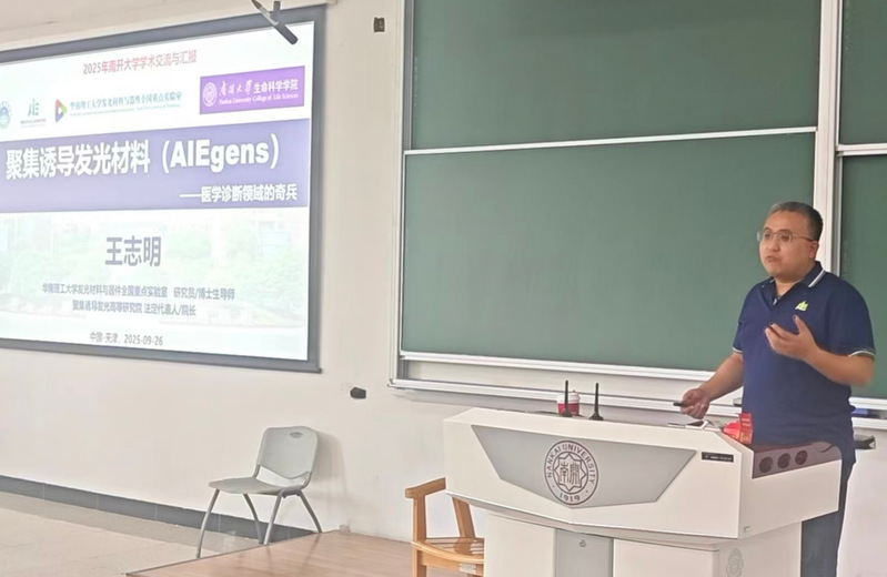 随后,王志明教授回顾了唐本忠院士团队在AIE领域长达十余年的科研攻坚历程,重点介绍了该材料如何从实验室一步步走向临床检测应用的关键突破。他以实际问题为导向,拆解科研与转化难点,展示从理论到实践的完整创新路径,为同学们提供了全新的科研思维与解题视角。