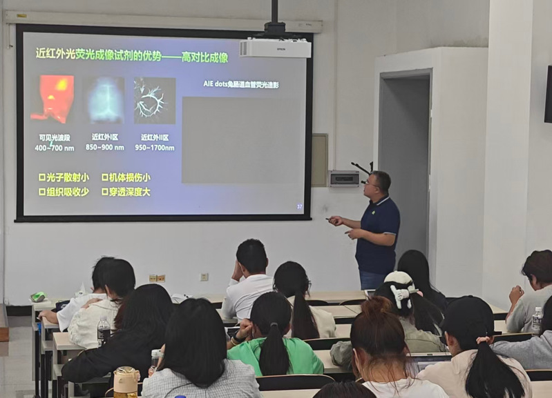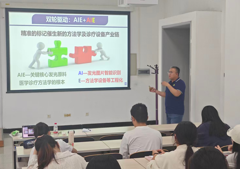 课程开始,王志明教授以其科研团队的重大成果——聚集诱导发光材料(AIE)的概念为引,生动讲述了该材料从基础研究到临床应用的转化历程,并从分子、细胞及微生物等多个层面,系统阐释了AIE技术为医学检验学科带来的创新赋能。
